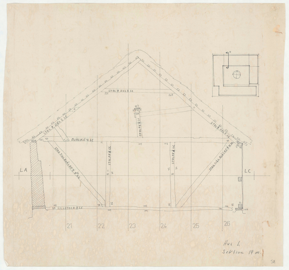 Titel: Skånegården. Norra log- och ladlängan. Sektionsritning Hus L.
