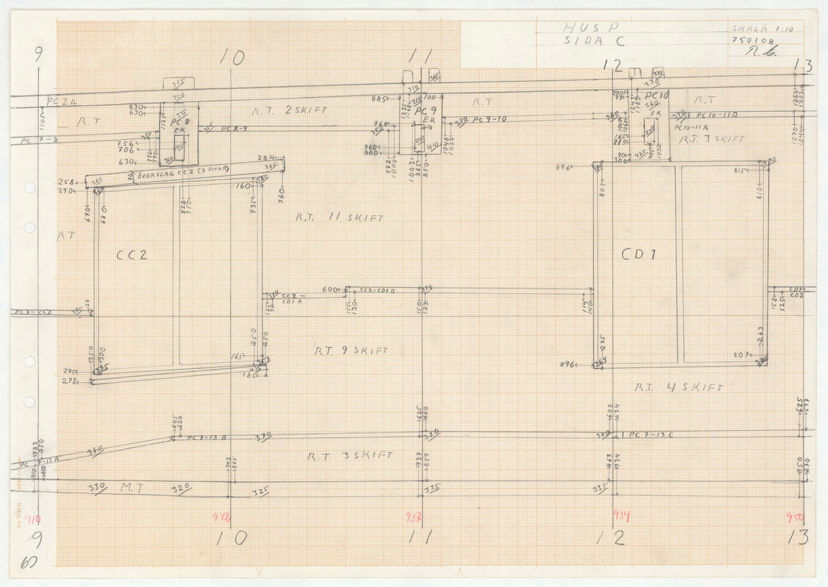 Titel: Skånegården. Bostadshuset. Detaljritning. HUS P. SIDA C. Skala 1:10
