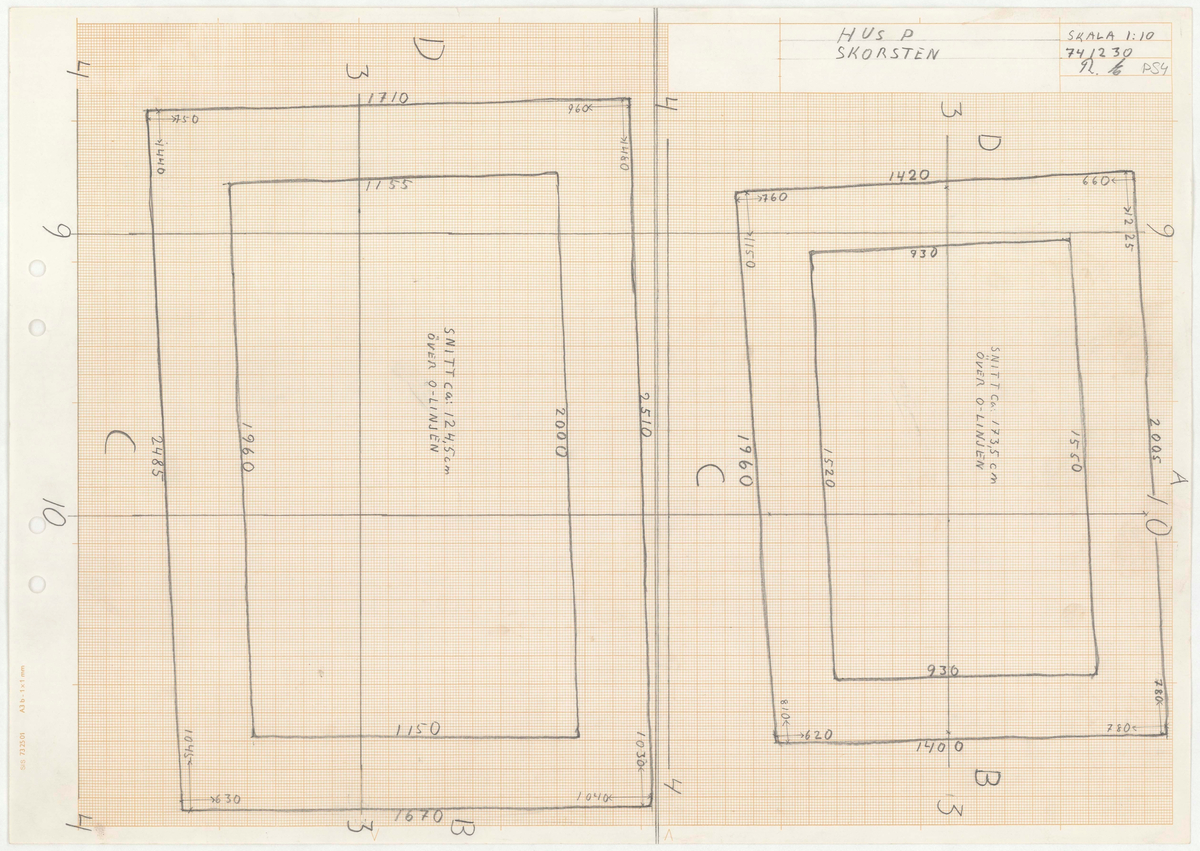 Titel: Skånegården. Bostadshuset. Detaljritning. Snitt HUS P SKORSTEN
