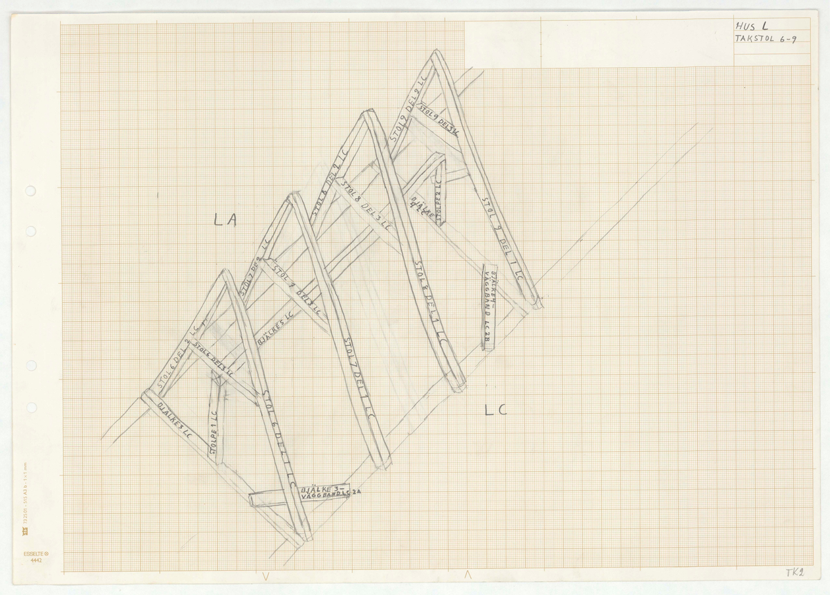 Titel: Skånegården. Norra log- och ladlängan. HUS L. TAKSTOL 6-9.