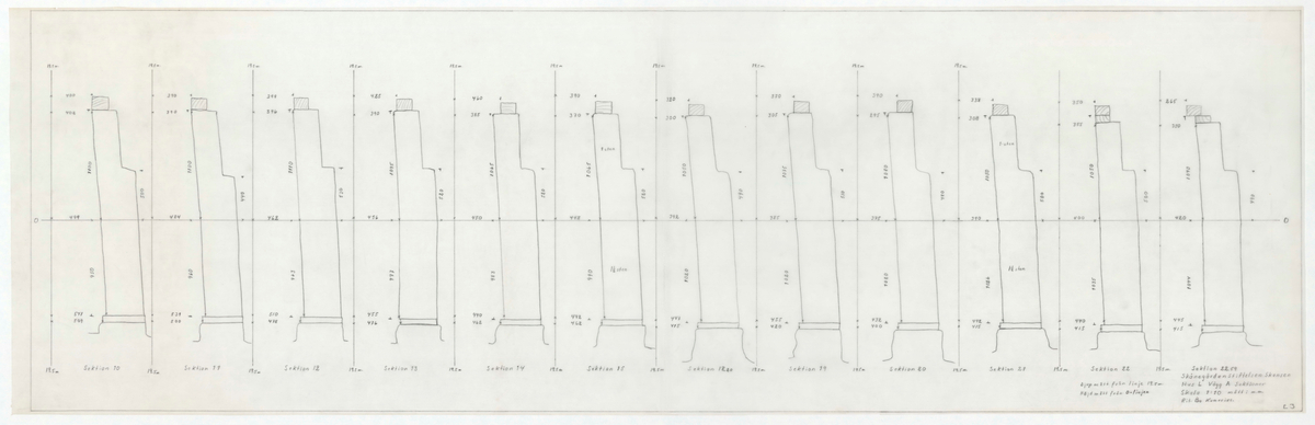 Titel: Skånegården. Norra log- och ladlängan. Detaljritning/sektionsritning. Hus L. Vägg A. Skala 1:10