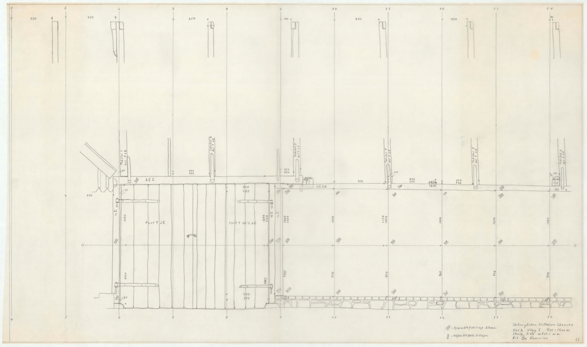 Titel: Skånegården. Norra log- och ladlängan. Detaljritning. Hus L. Vägg C. Skala 1:10