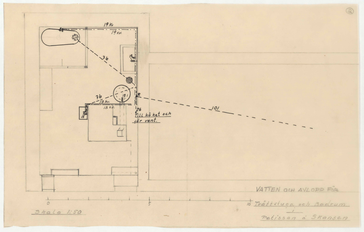 Titel: Apoteket/Petissan. Planritning. Vatten och avlopp för tvättstuga och badrum i Petissan å Skansen.
