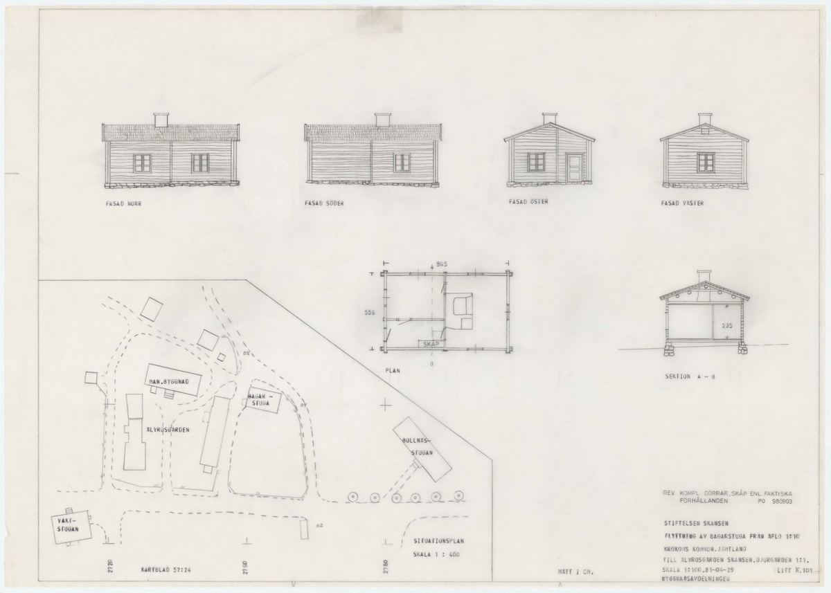Titel: Bagarstugan. Planritning. Fasadritning. Sektionsritning. Situationsplan.