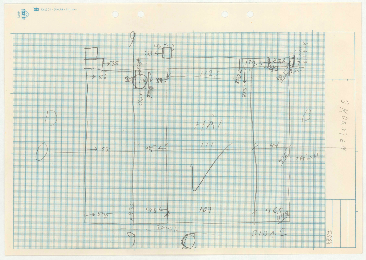 Titel: Skånegården. Bostadshuset. Detaljritning SKORSTEN HÅL TEGEL