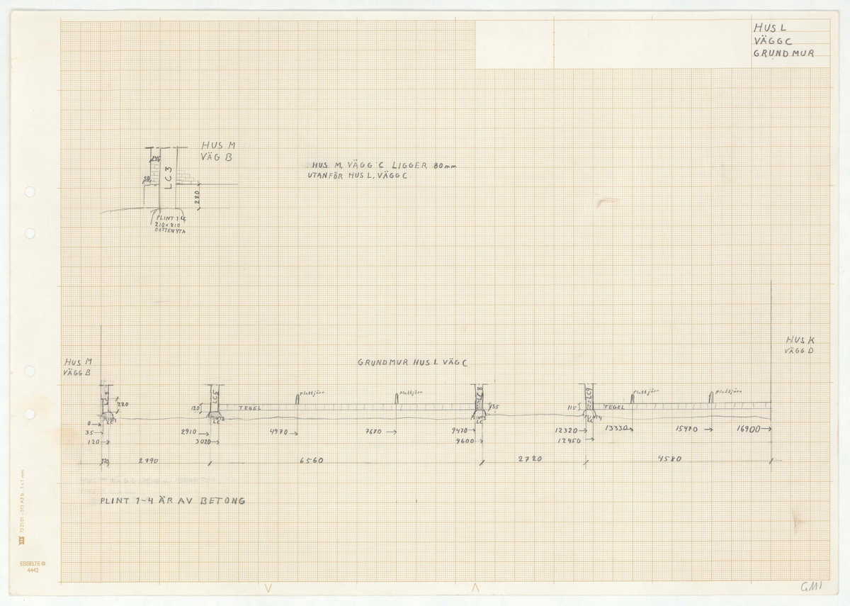 Titel: Skånegården. Norra log- och ladlängan. Detaljritning. HUS L. VÄGG C. GRUNDMUR. Mer text finns.