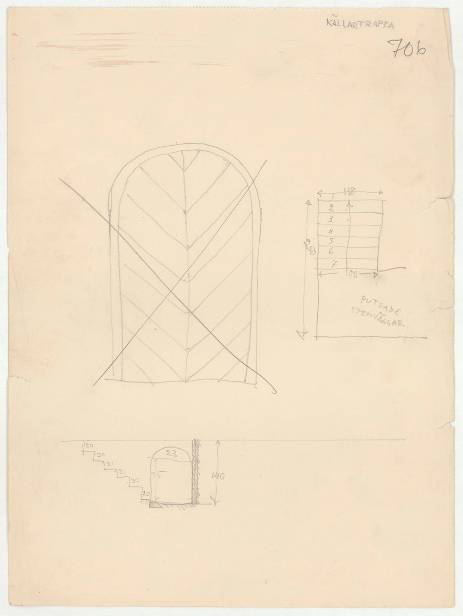 Titel: Skogaholms herrgård. Huvudbyggnaden. Detaljritning. Källartrappa.