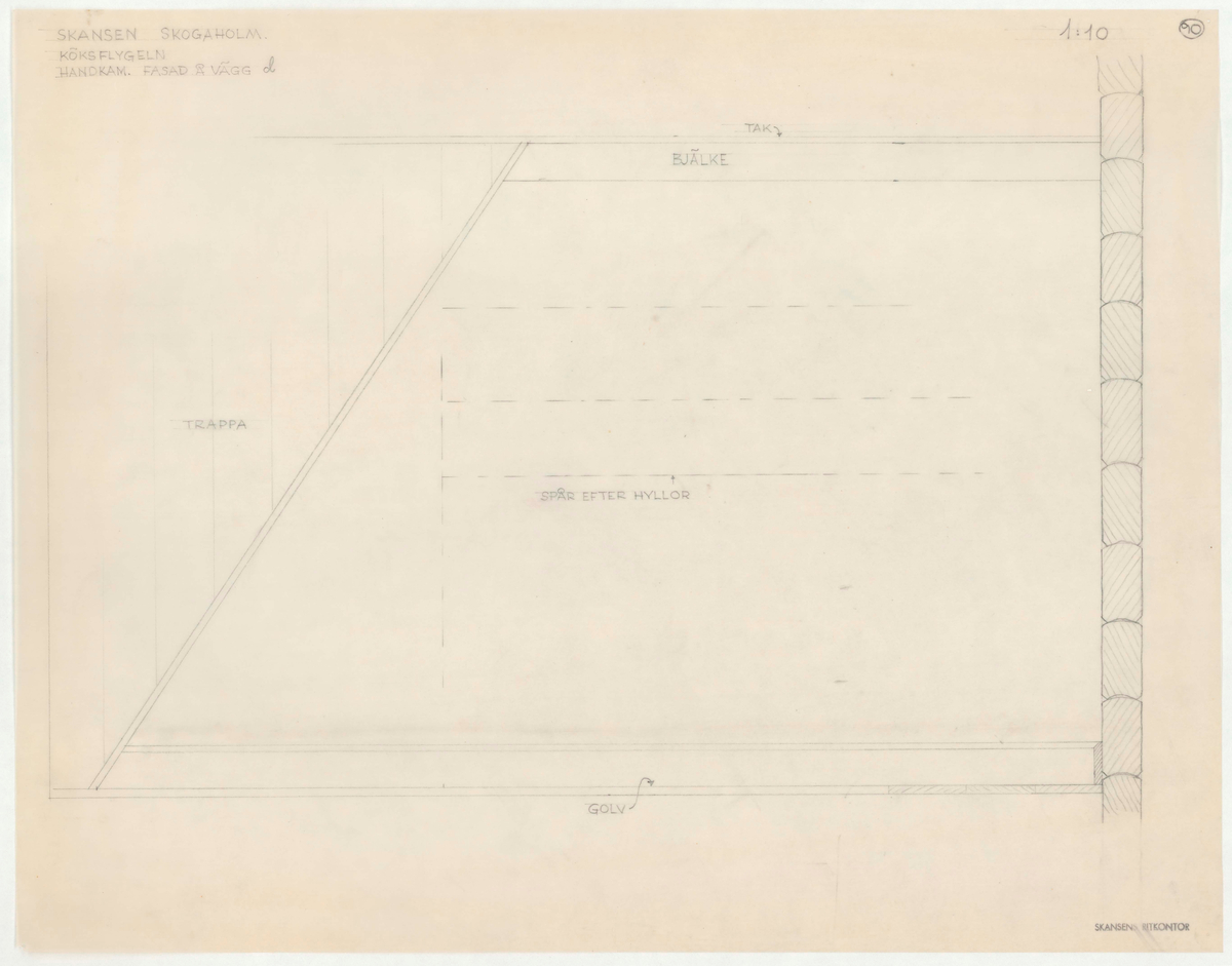 Titel: Skogaholms herrgård. Köksflygeln. Detaljritning. HANDKAMMAREN. FASAD OCH VÄGG. Skala 1:10