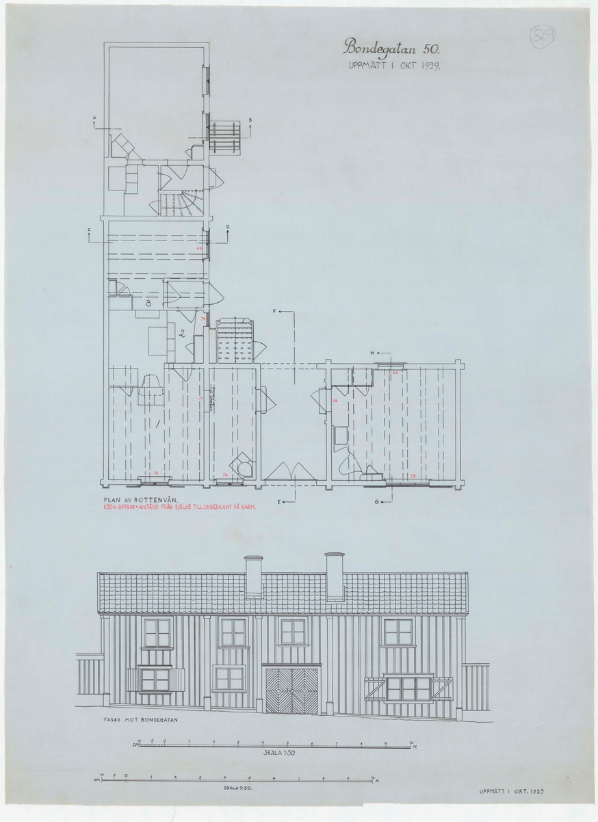 Titel: Kryddkramhandlarens hus. Uppmätningsritning. Plan av bottenvåning. Fasad mot Bondegatan.
