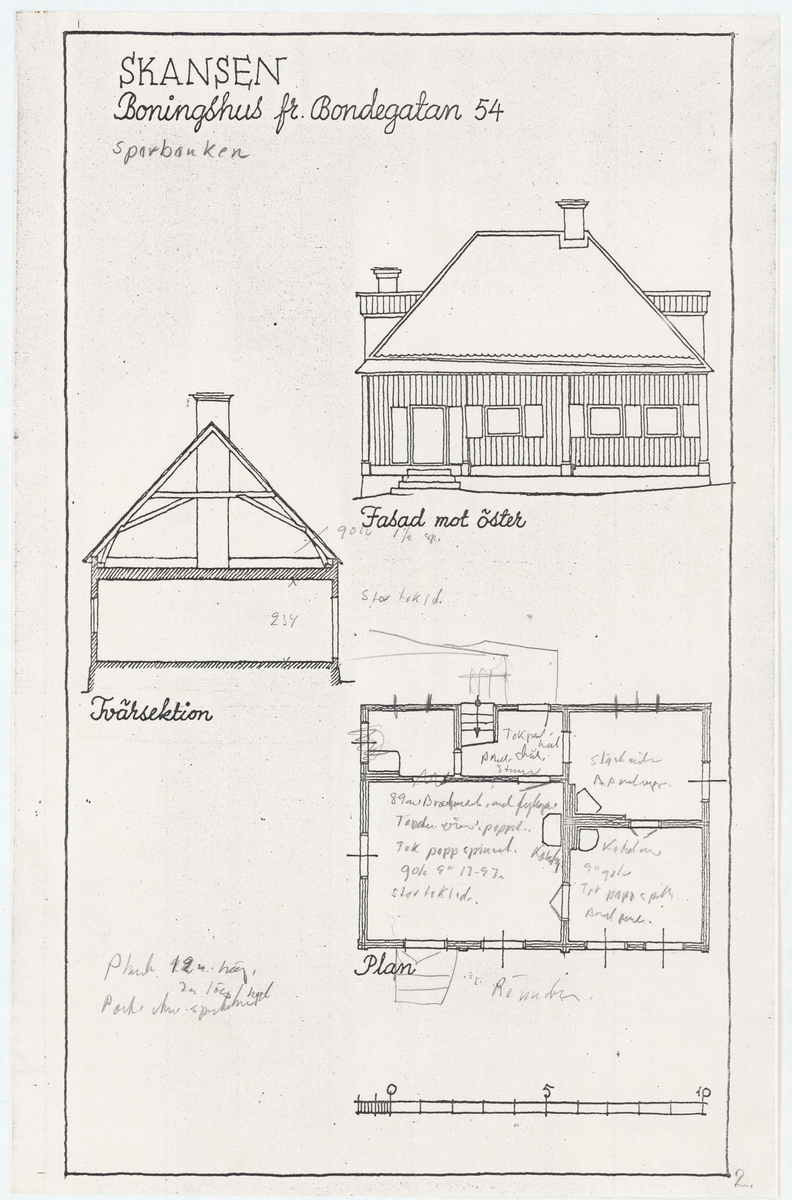 Titel: Sparbanken. Planritning. Fasadritning. Sektionsritning.