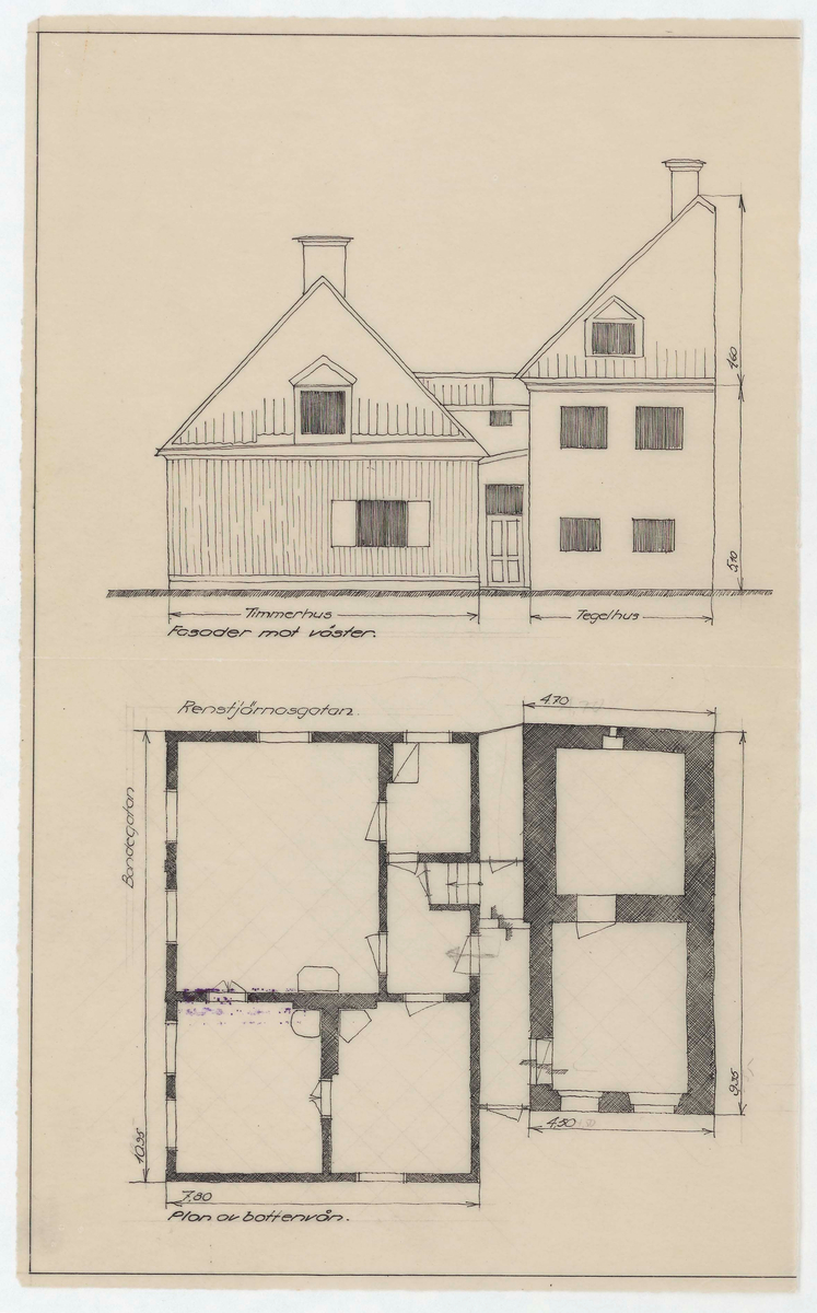 Titel: Sparbanken. Planritning. Bottenvåningen. Fasadritning. Fasad mot väster (ursprunglig plats).