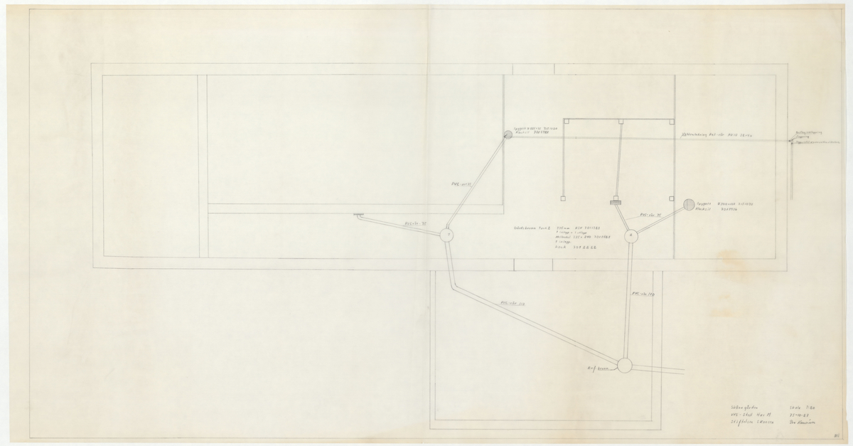 Titel: Skånegården. Stallet. Detaljritning. VVS- Stall. HUS M. Skala 1:20