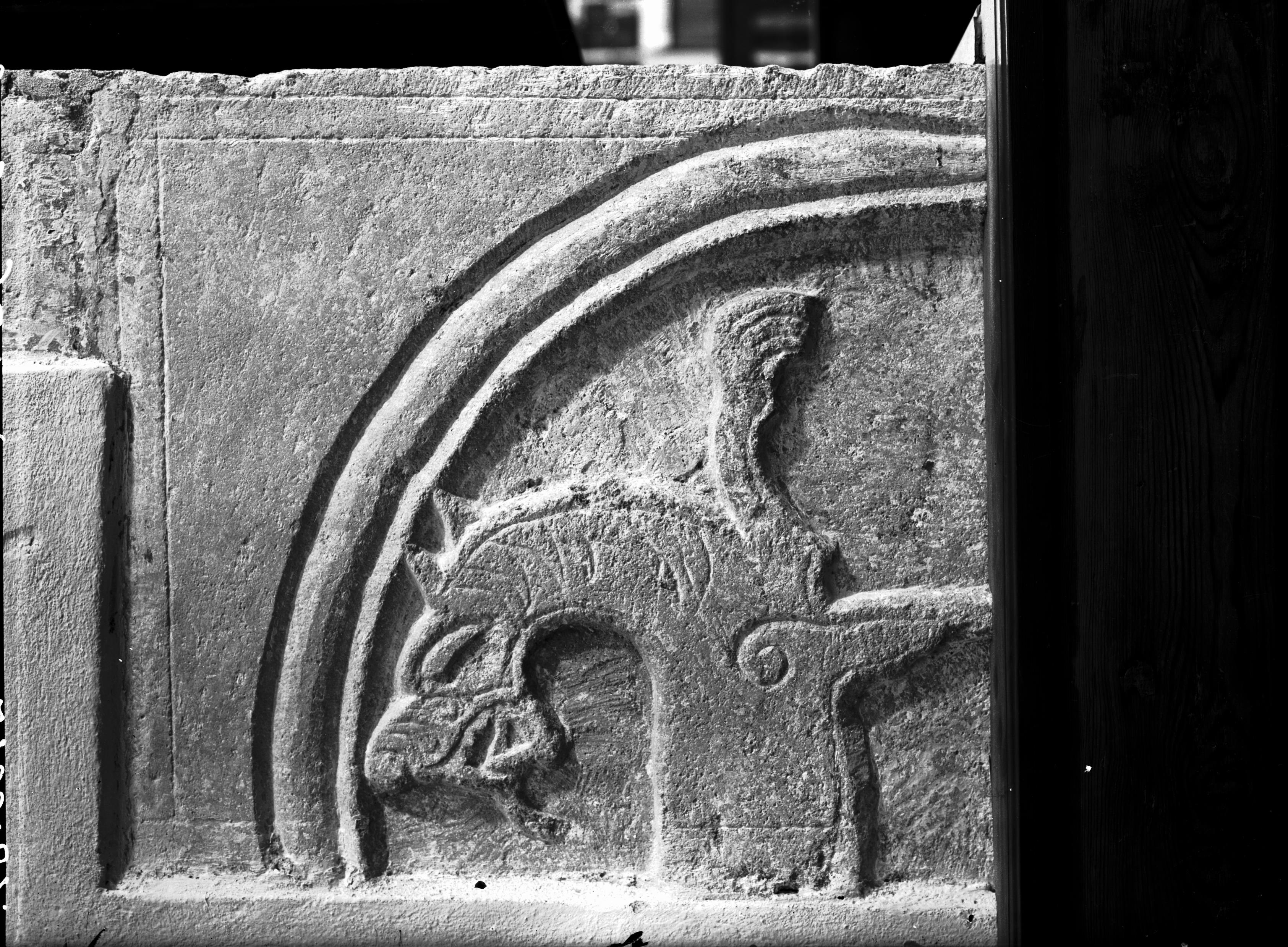 Halv rundbågsrelief vid triumfbågen i norra vederlaget.