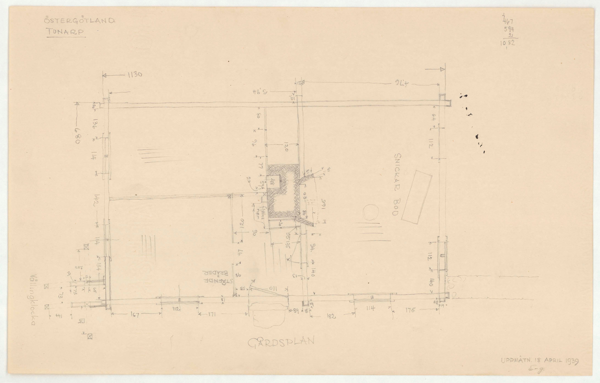 Titel: Skogaholms herrgård. Planritning. GÅRDSPLAN. SNICKARBOD. STÅENDE BRÄDER.