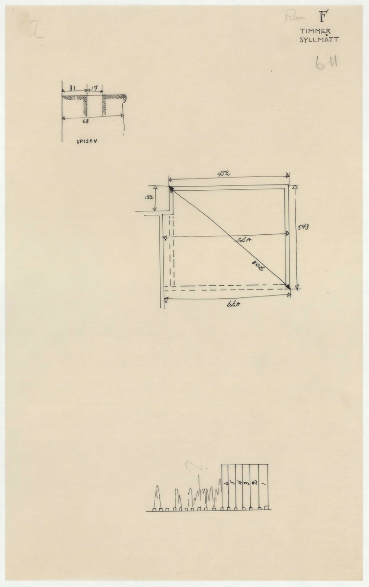 Titel: Skogaholms herrgård. Huvudbyggnaden. Detaljritning. TIMMER. SYLLMÅTT. SPISEN.