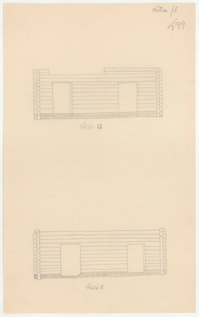 Titel: Skogaholms herrgård. Biblioteksflygeln. Detaljritning. Västra flygeln. VÄGG G. VÄGG F.