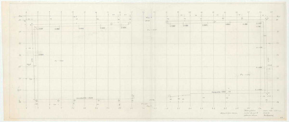 Titel: Skånegården. Västra loglängan. Detaljritning. Sockel loge K. Skala 1:20