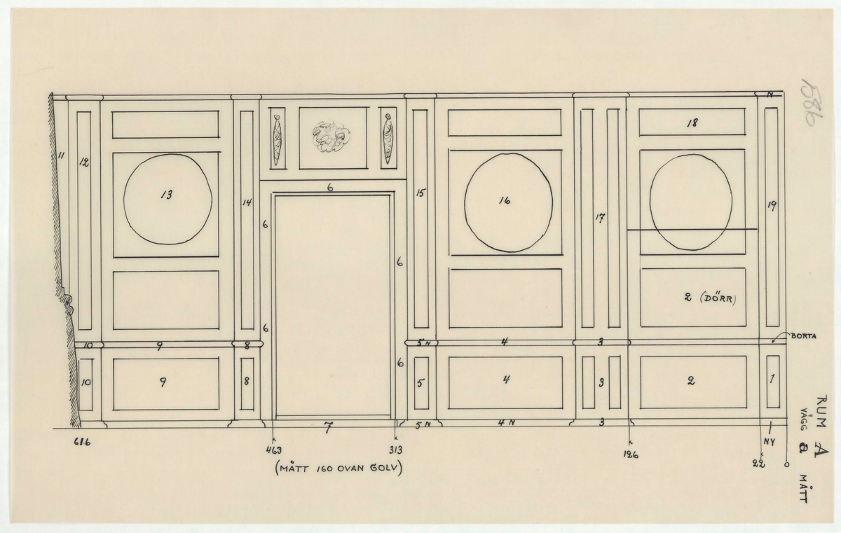 Titel: Skogaholms herrgård. Huvudbyggnaden. Detaljritning. RUM A. VÄGG a. MÅTT.