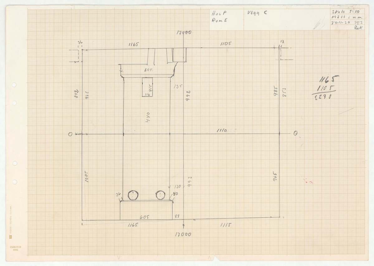 Titel: Skånegården. Bostadshuset. Detaljritning. Hus P. Rum E. Vägg C. Skala 1:10