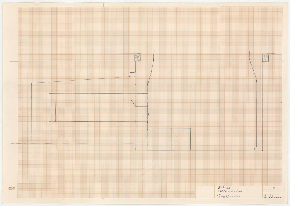 Titel: Skånegården. Bostadshuset. Detaljritning Bakugn. Längdsektion.