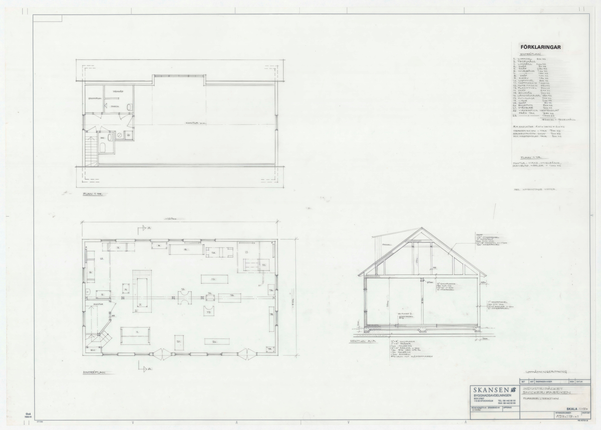 Titel: Snickerifabriken. Planritning. Plan 1 tr. Entréplan. Sektionsritning. Sektion A-A.