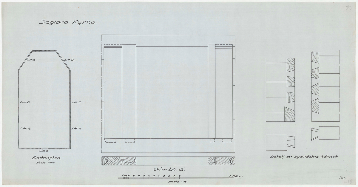 Titel: Seglora kyrka. Planritning. Profilritning. Dörr. Profilritning. Detalj av sydvästra hörnet.
