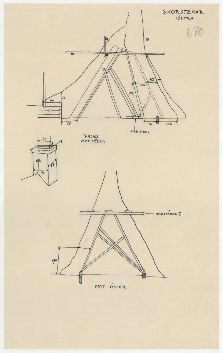 Titel: Skogaholms herrgård. Huvudbyggnaden. Detaljritning. SKORSTENAR ÖSTRA. FASAD MOT SÖDER.