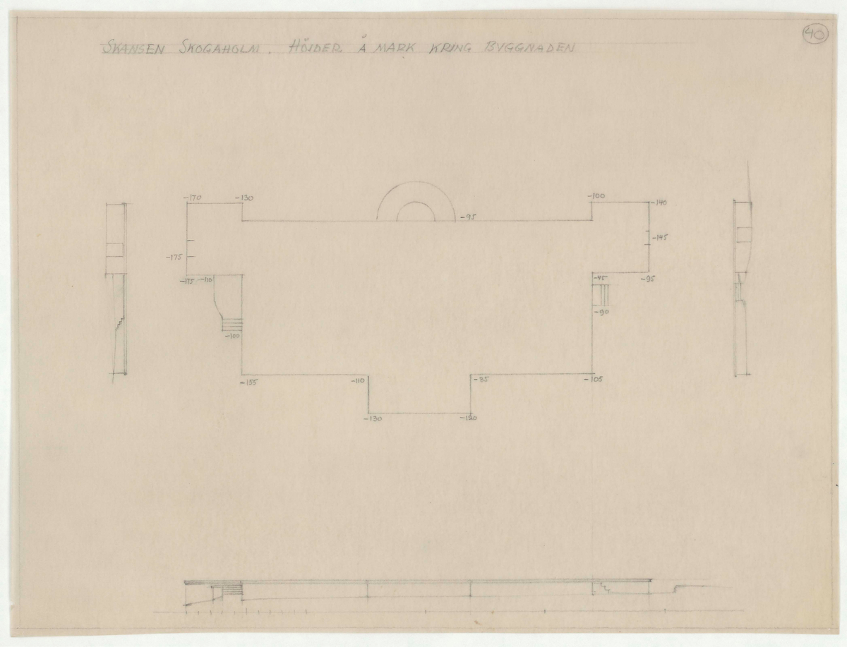 Titel: Skogaholms herrgård. Huvudbyggnaden. Detaljritning. HÖJDER Å MARK KRING BYGGNADEN.