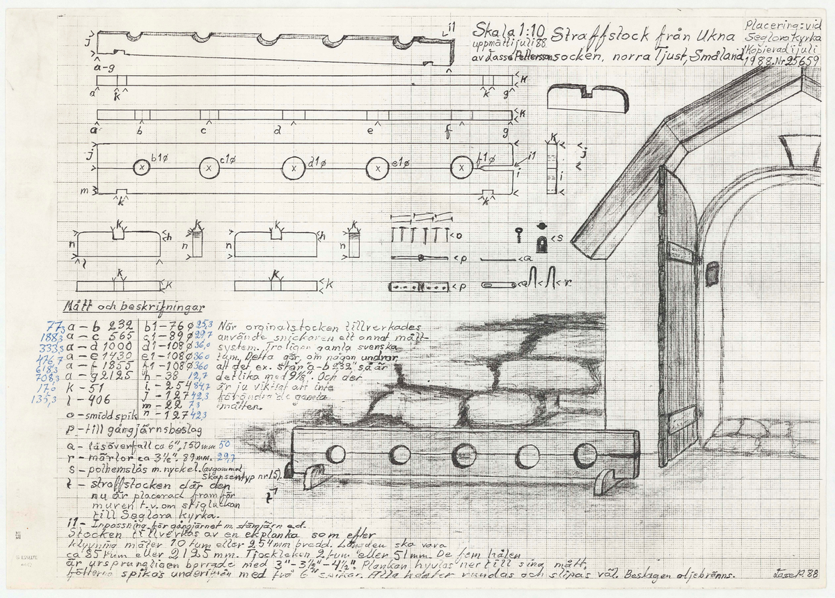 Titel: Seglora kyrka. Profilritning Straffstock..