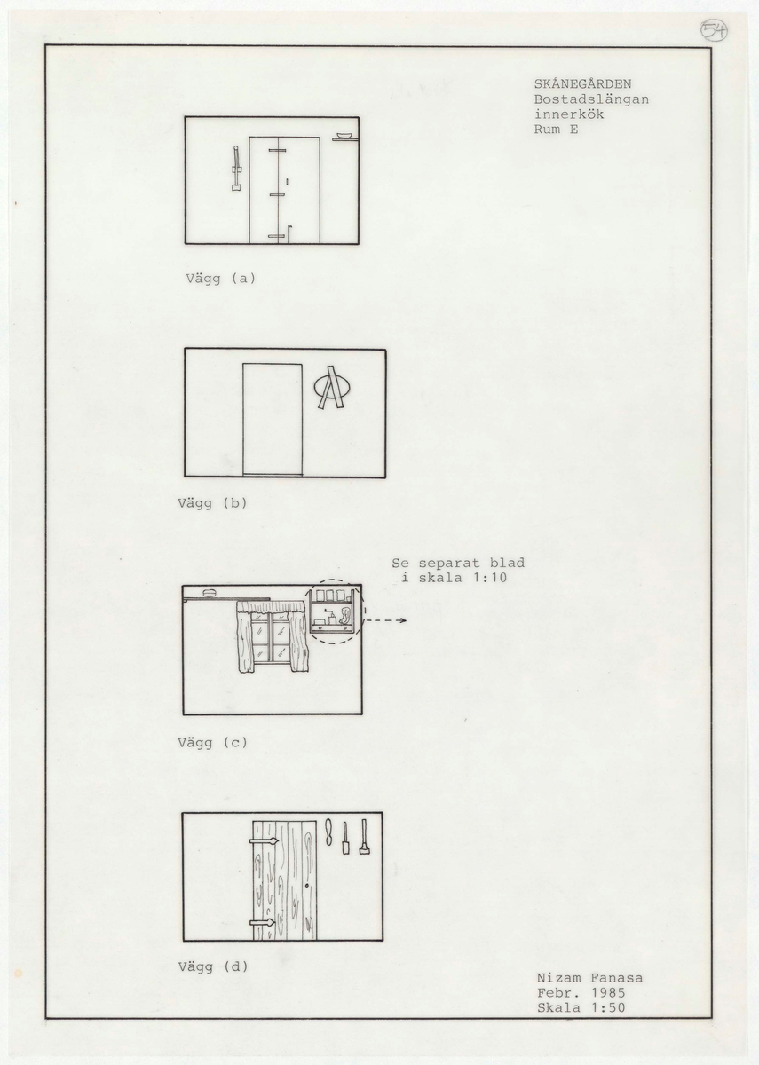 Titel: Skånegården. Bostadshuset. Detaljritning. Innerkök Vägg (a) Vägg (b) Vägg (c) Vägg (d) Skala 1:50