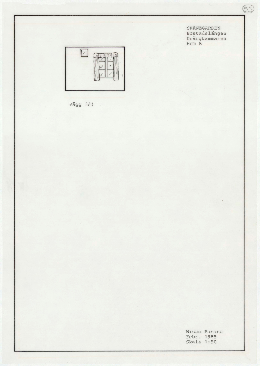 Titel: Skånegården. Bostadshuset. Drängkammaren. Detaljritning. Rum B. Vägg. Skala 1:50