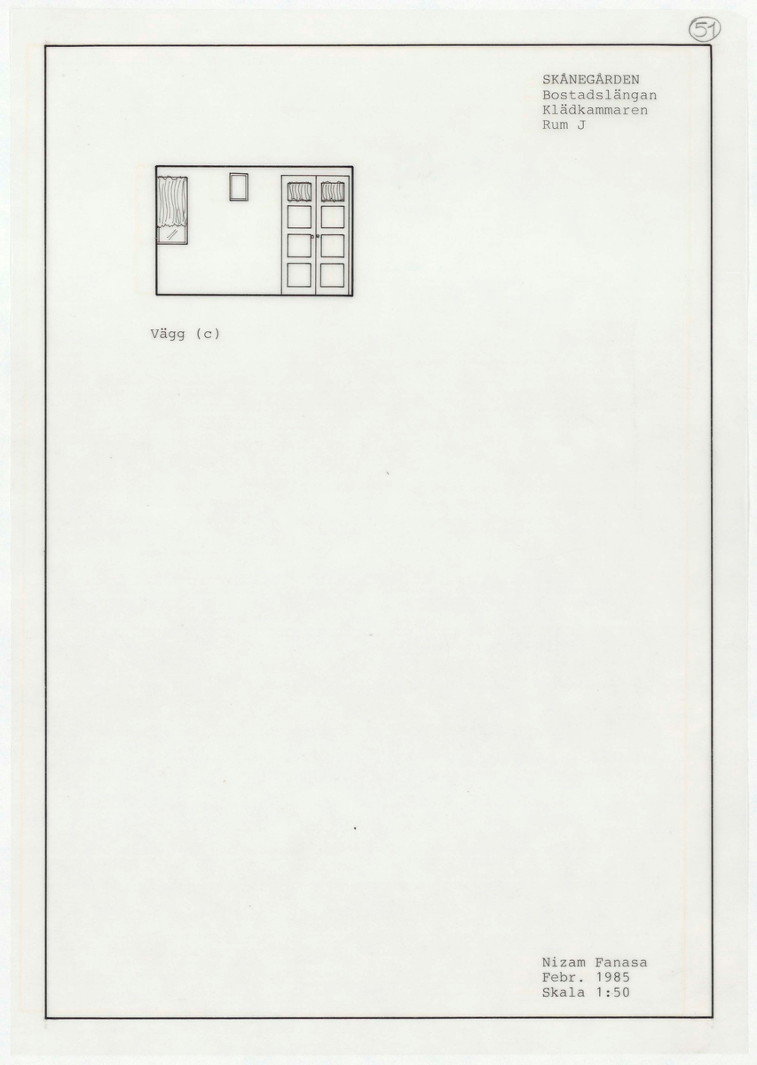 Titel: Skånegården. Bostadshuset. Detaljritning. Klädkammaren Rum J. Skala 1:50