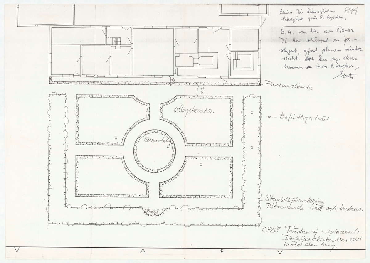 B.A. var här den 6/8-82. Vi har skissat om förslaget, gjort planen mindre strikt. En ny plan kommer inom 2 veckor / Mats [Mats Jansson]