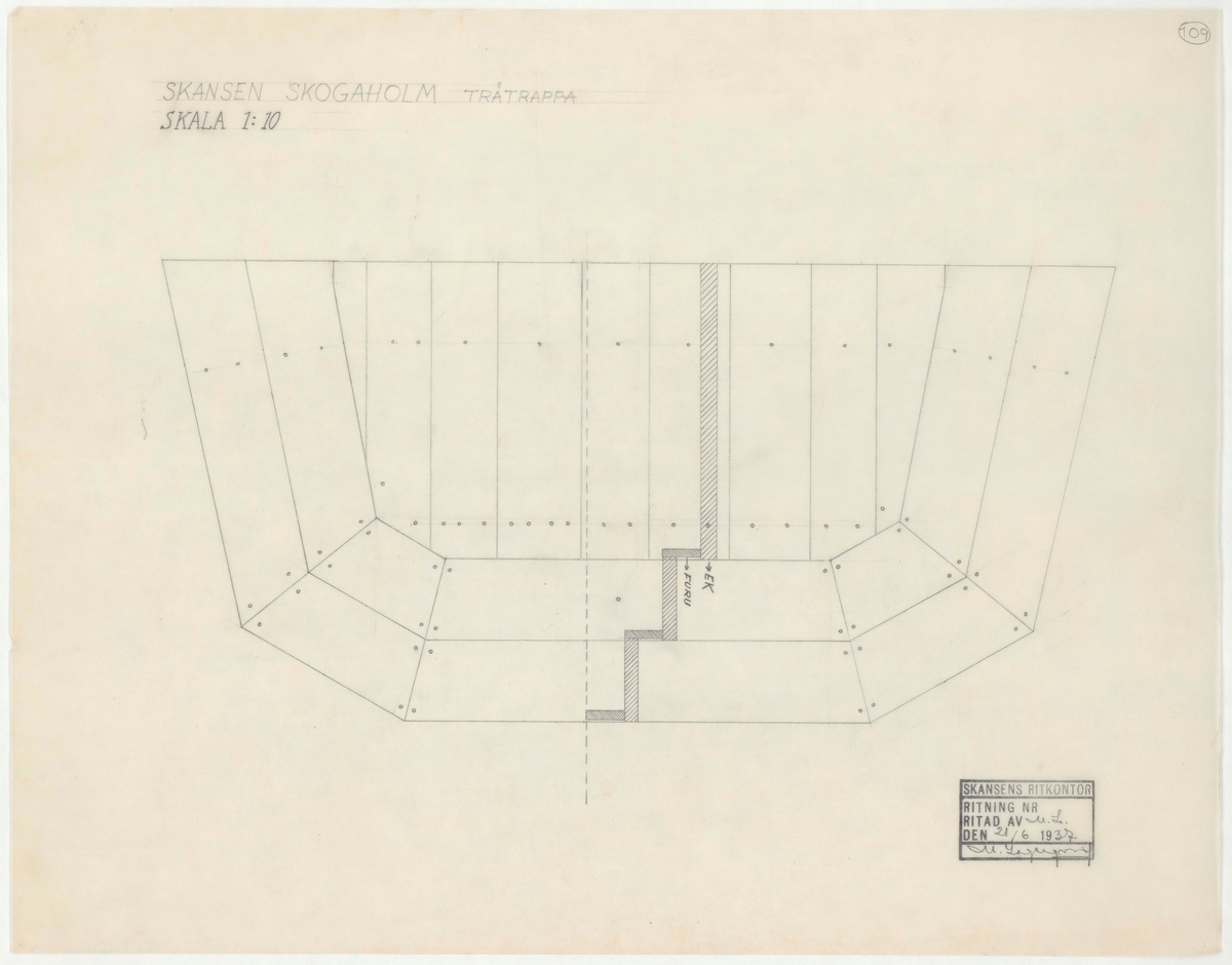 Titel: Skogaholms herrgård. Biblioteksflygeln. Detaljritning. TRÄTRAPPA. Skala 1:10
