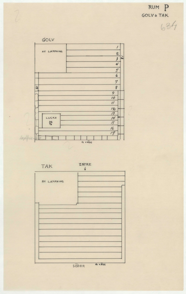 Titel: Skogaholms herrgård. Huvudbyggnaden. Detaljritning. RUM P. GOLV OCH TAK.