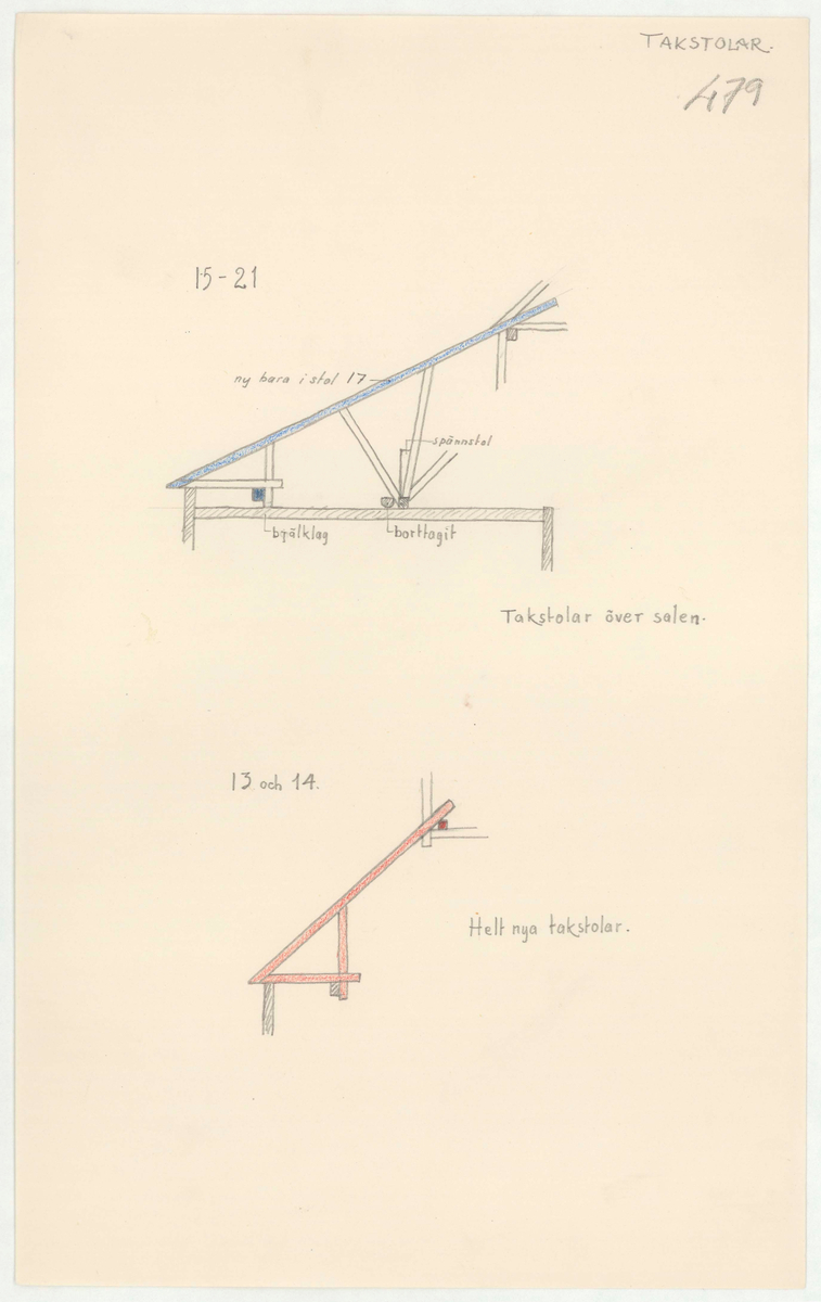 Titel: Skogaholms herrgård. Huvudbyggnaden. Detaljritning. TAKSTOLAR.