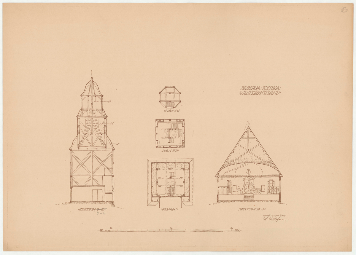 Titel: Seglora kyrka. Planritning. Sektionsritning.