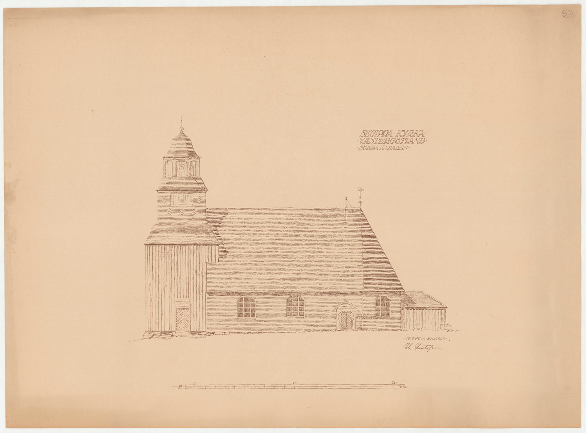 Titel: Seglora kyrka. Ursprungsplatsen i Västergötland. Fasad ritning. Södra fasaden.