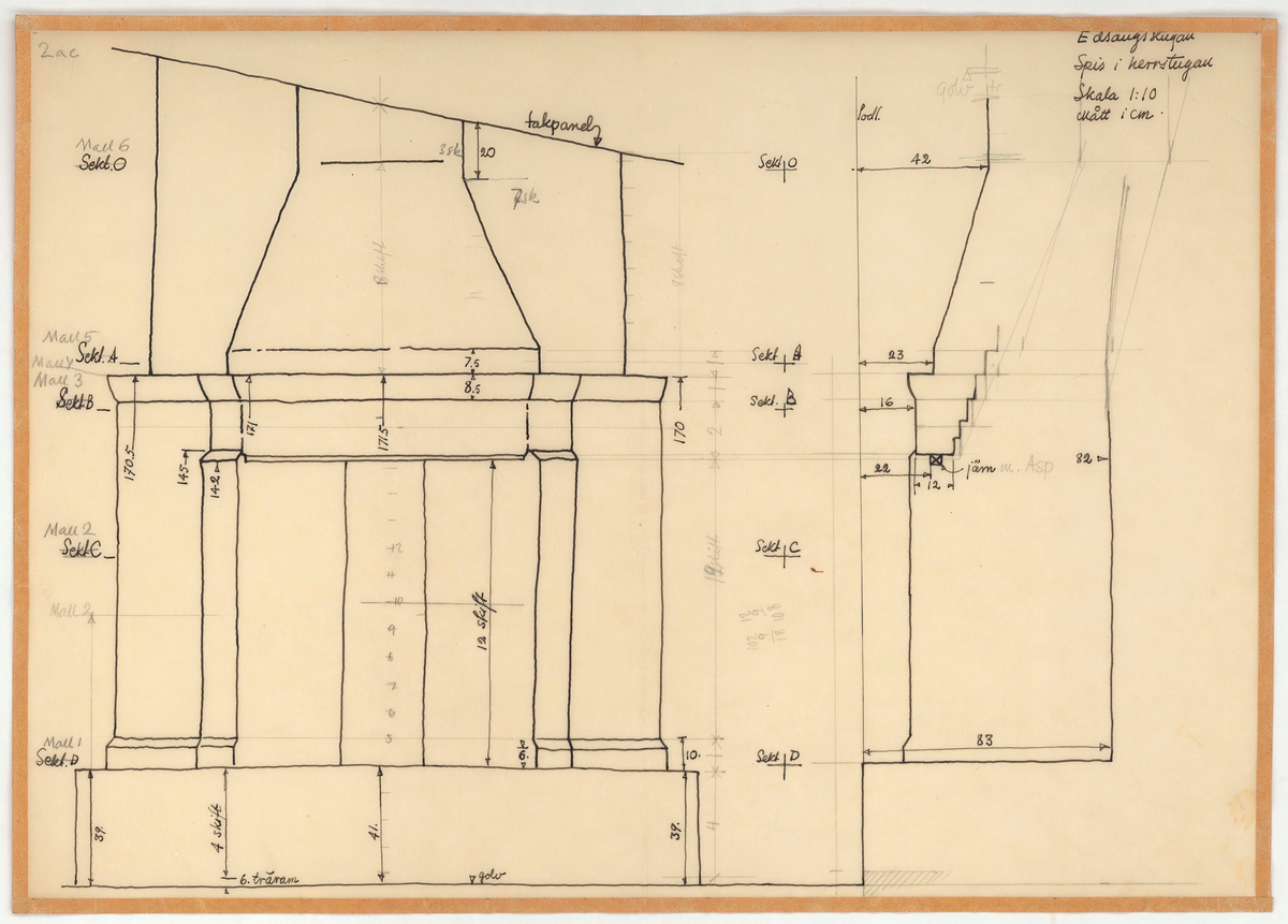 Titel: Delsbogården. Uppmätningsritning. Edsängsstugan. Spisen i herrstugan.
