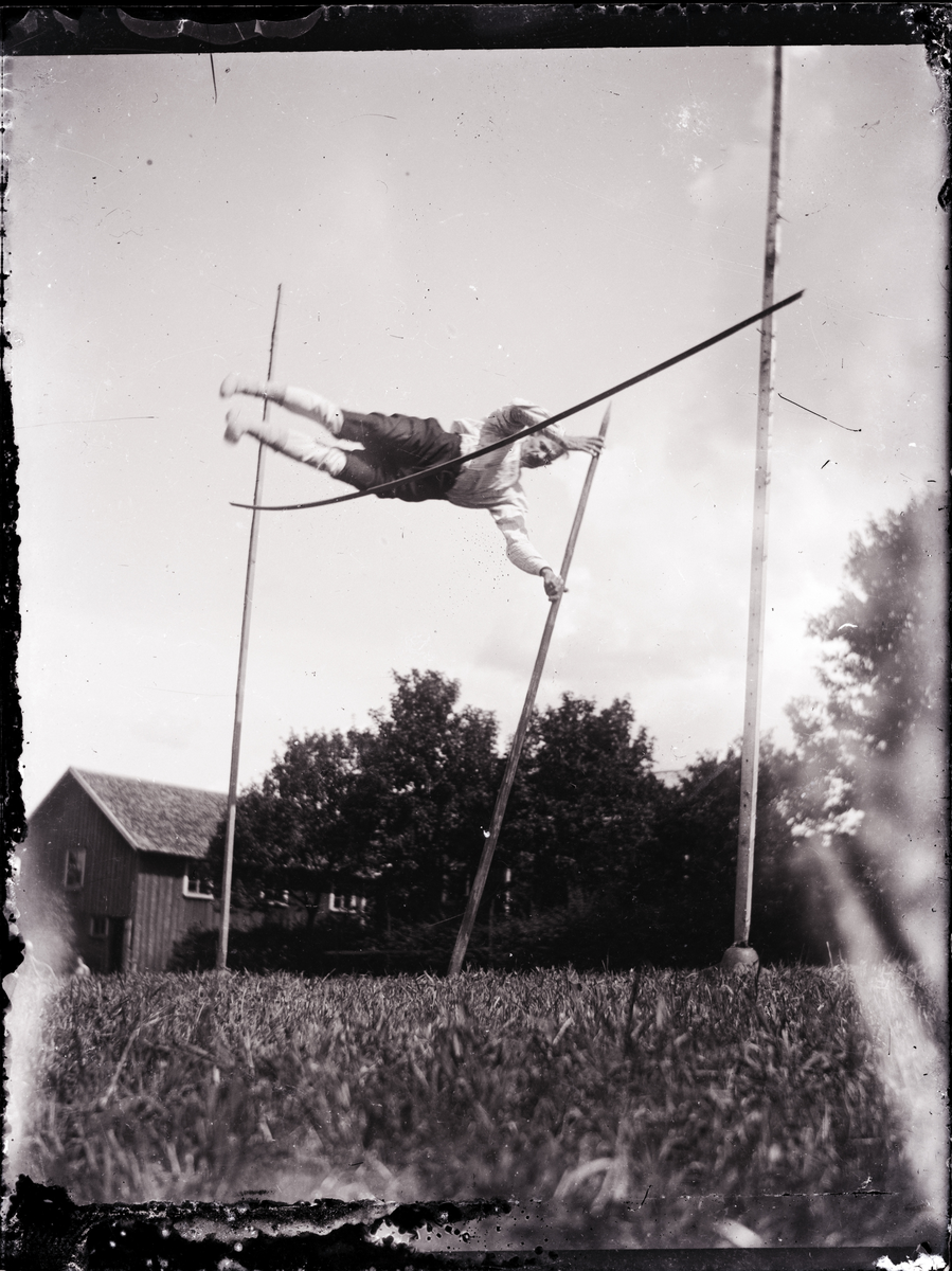 Nårunga. Olympiad 1912 - Gottfrid hoppar stav på åkern på andra sidan Grevakvarn.
