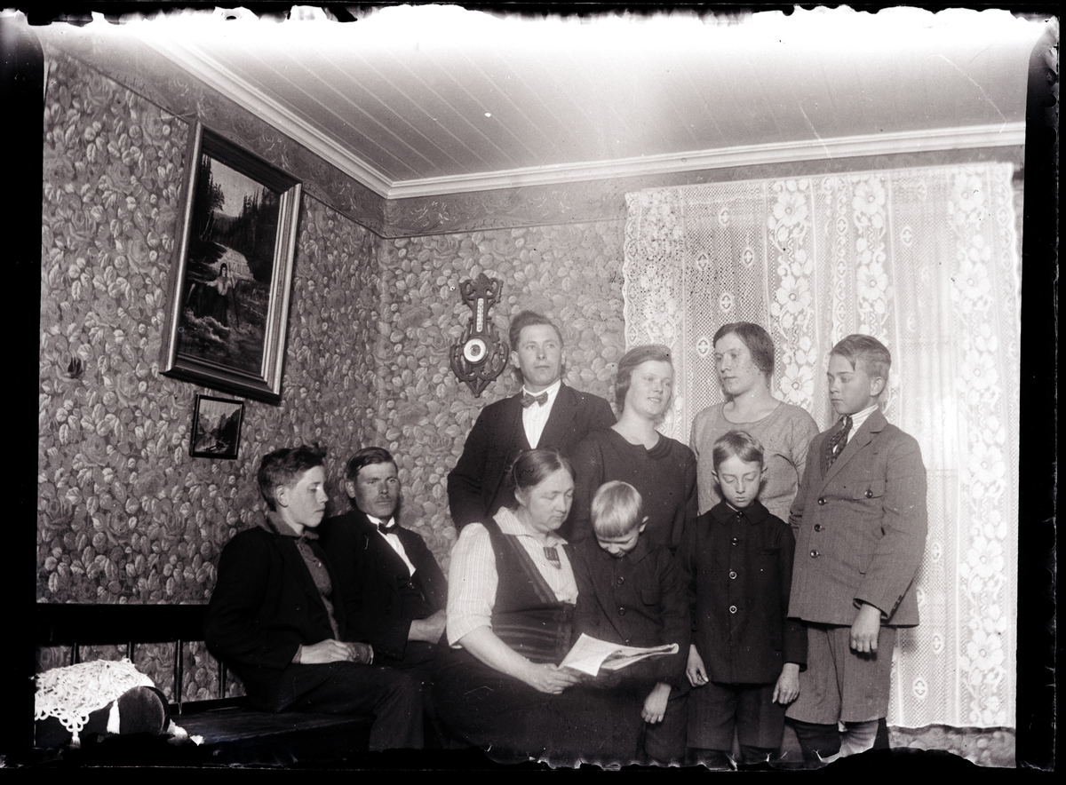 Nårunga. Från vänster: I soffhörnet Algot Leandersson, Hanna Benjaminsson, nr 3 kan vara Karl Andersson bror till Algot eller Oskar i Hukera dagsverkare på gården, Thor, Sten och Ebbe Benjaminsson.