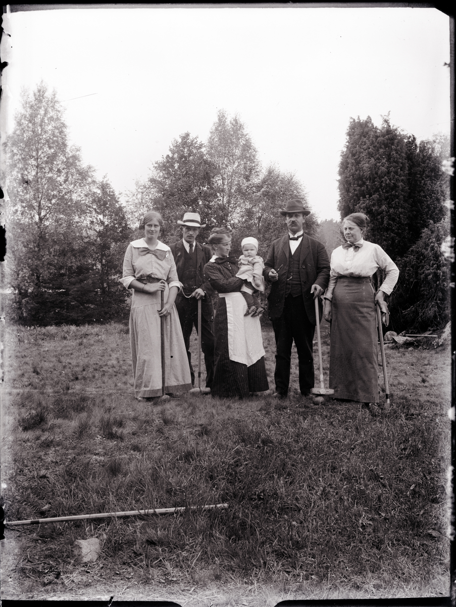 Nårunga. Krocketspel. Från Vänster: Anna-Lisa Benjaminsson, Karl Fredriksson, Lotten Fredriksson (fd Benjaminsson) med Margit Fredriksson, Axel Benjaminsson, Annie Ogden.