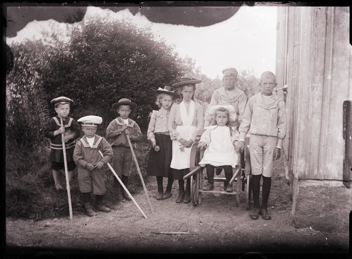 Nårunga. Stående från vänster: okänd, Einar Hallhagen, Frithiof Hallhagen, Valborg Benjaminsson, Dagmar Benjaminsson, övriga okända