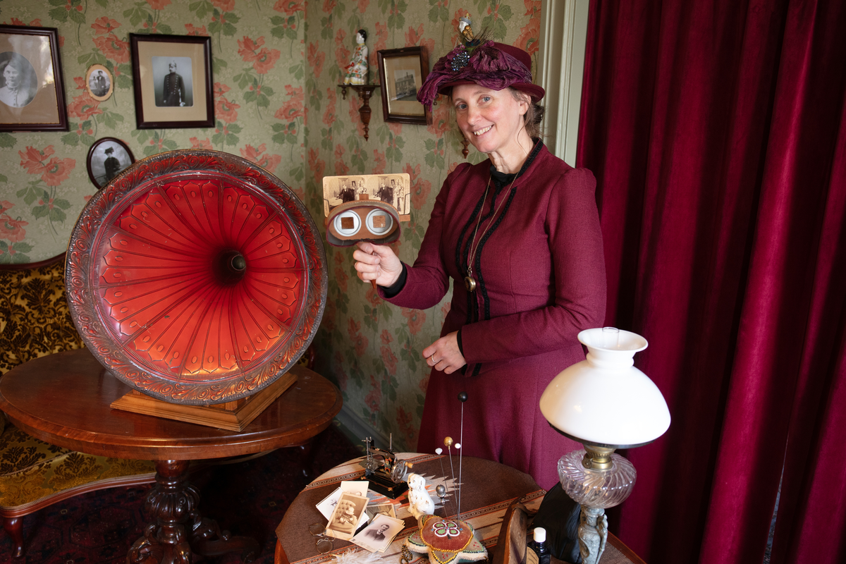 Vänersborgs museum. Museipedagog Greta Åberg har dukat upp bord med föremål inför skolvisning