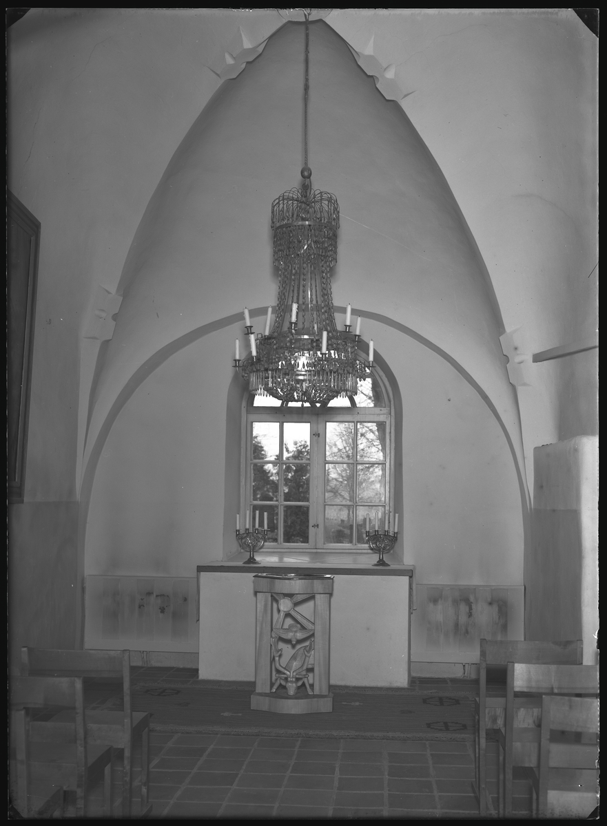 Interiör kyrka med dopfunt. Stig Jonsson. Rörstrandsgatan 14, Stockholm. Ur Gustaf Åhmans samling.
