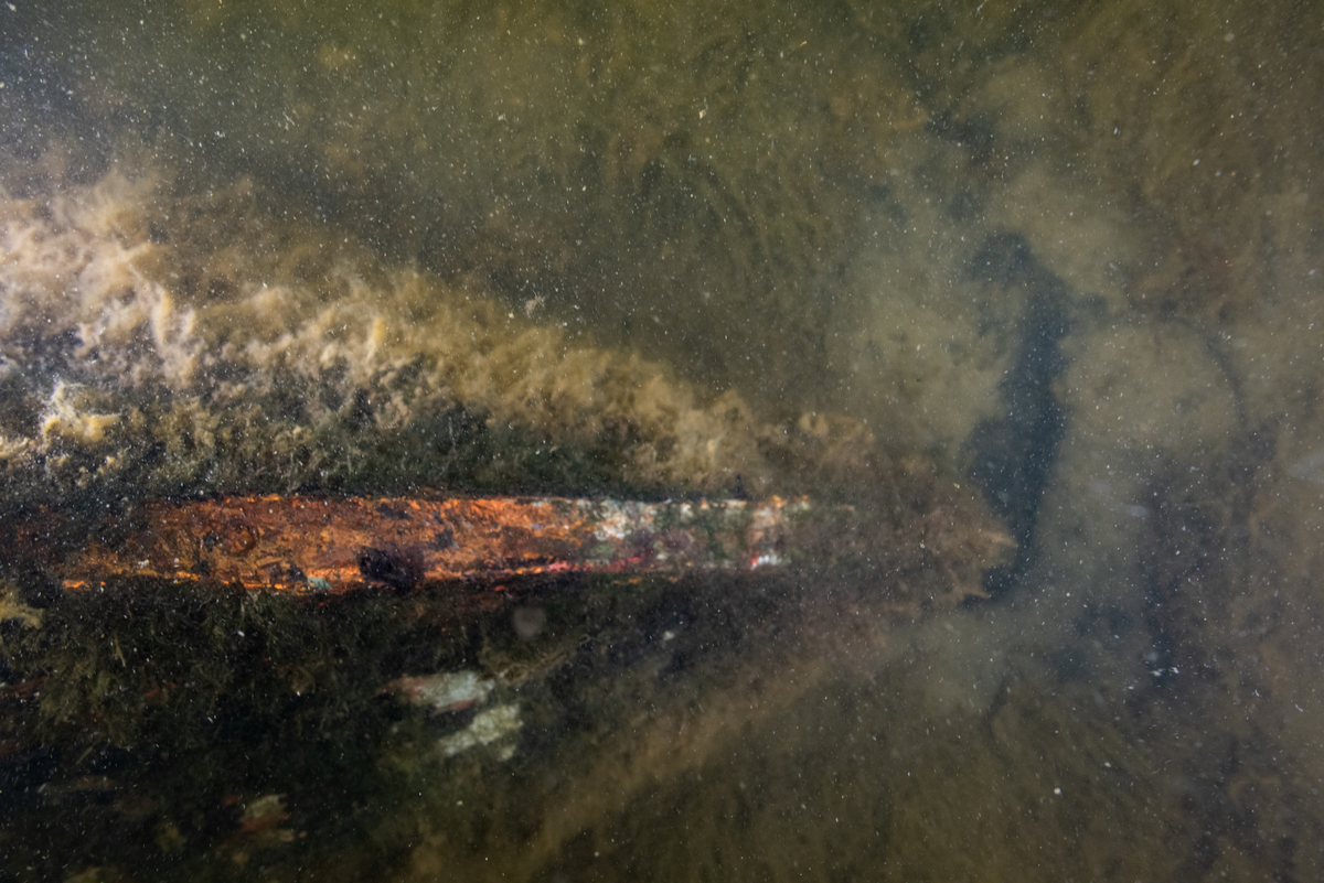 Vrakets förstäv sett ovanifrån. På den vänstra sidan av stäven syns spår efter en rund kopparnit.