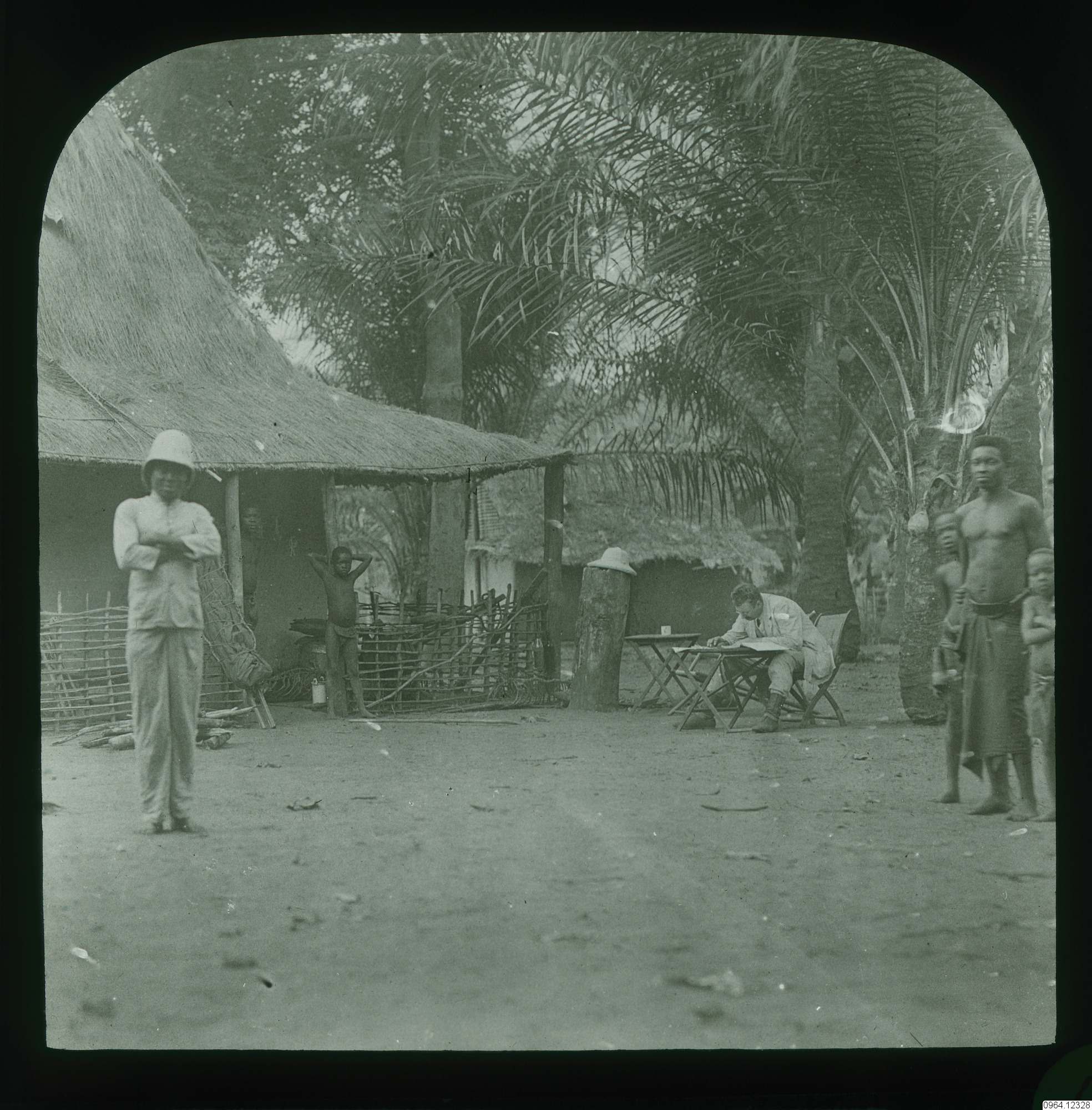 Missionär som sitter böjd över böcker och papper utanför hydda/hus.