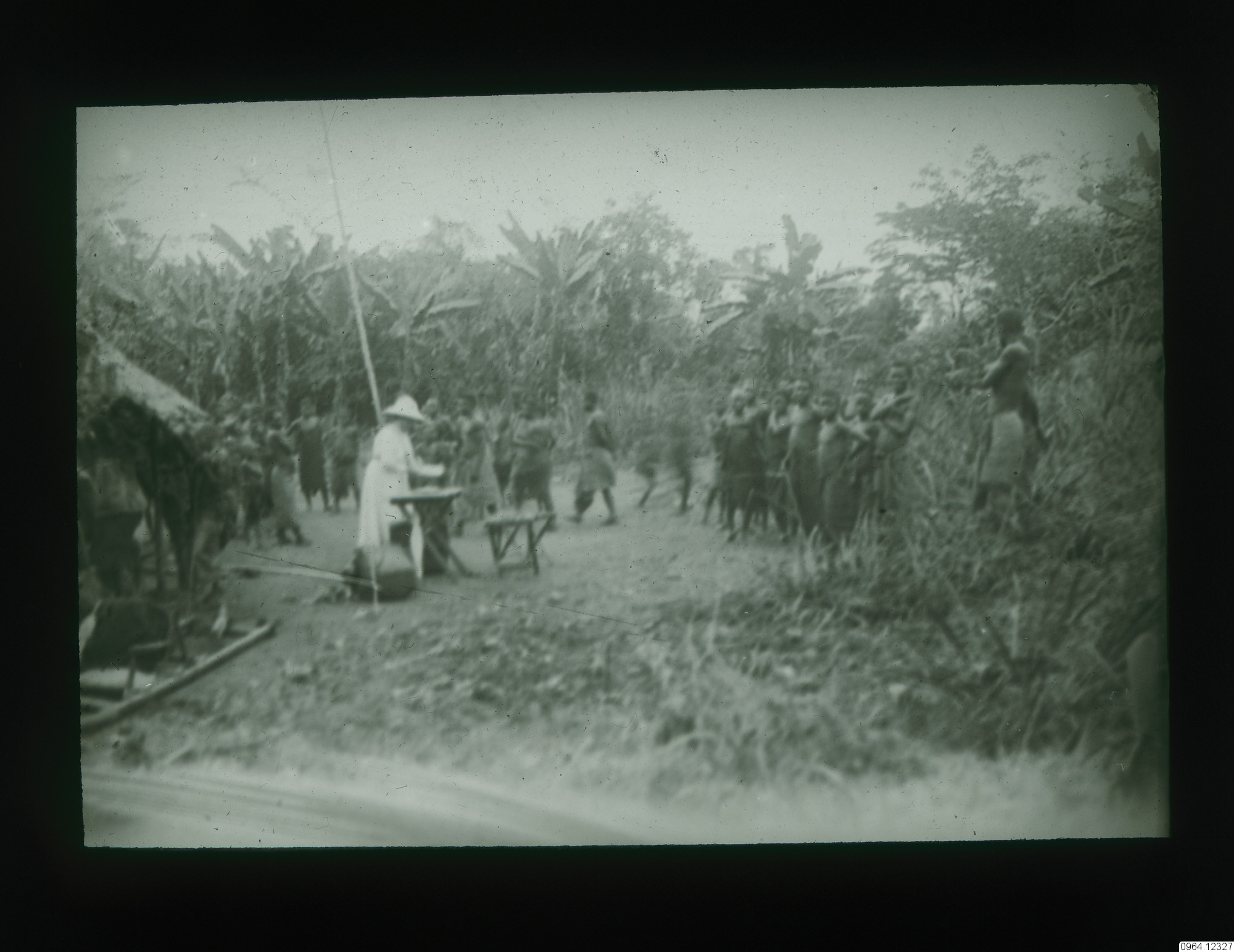 Kvinnlig missionär som står vid bord. Kanske delar hon ut medicin eller har mottagning för sjuka?