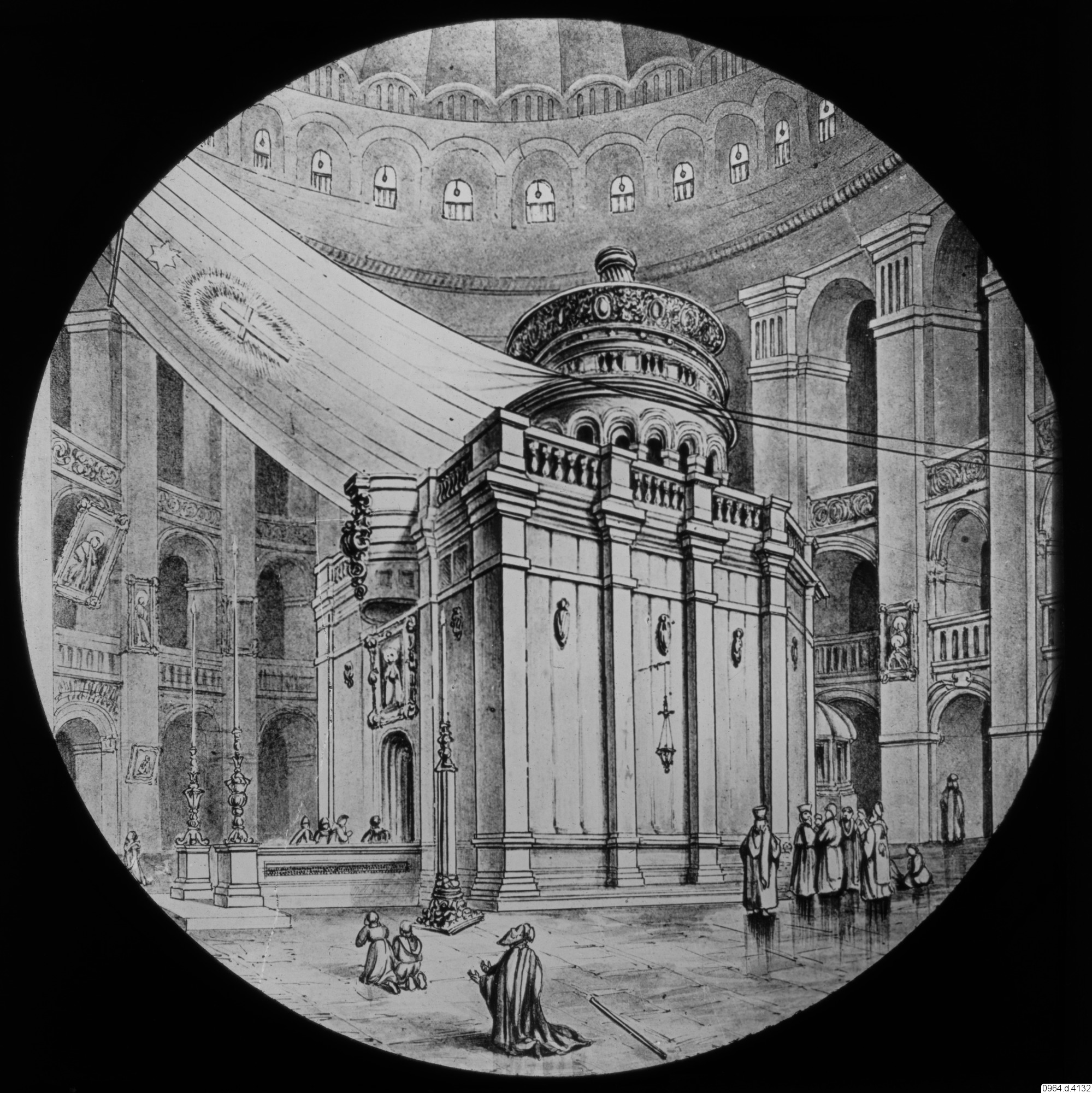 Palestina. Jerusalem. Heliga graven, interiör. Inne i kyrkan står en mindre kyrka, uppförd över den plats, där graven befinner sig. Illustration.