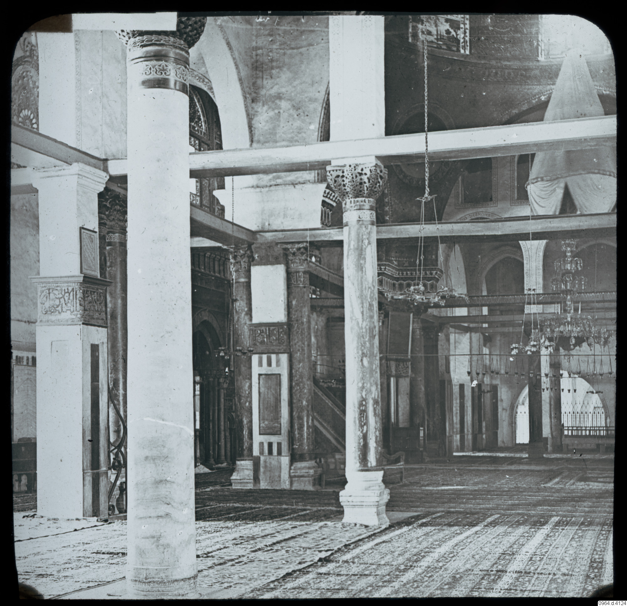 Palestina. Jerusalem. El Aksamoskén, interiör. På Tempelberget bredvid Klippdomen. Nuvarande moské i sten blev klar runt år 705. Var år 1099-1187 högkvarter för Tempelherreordern. Al-Aqsa moskén är den tredje viktigast moskén inom islam.